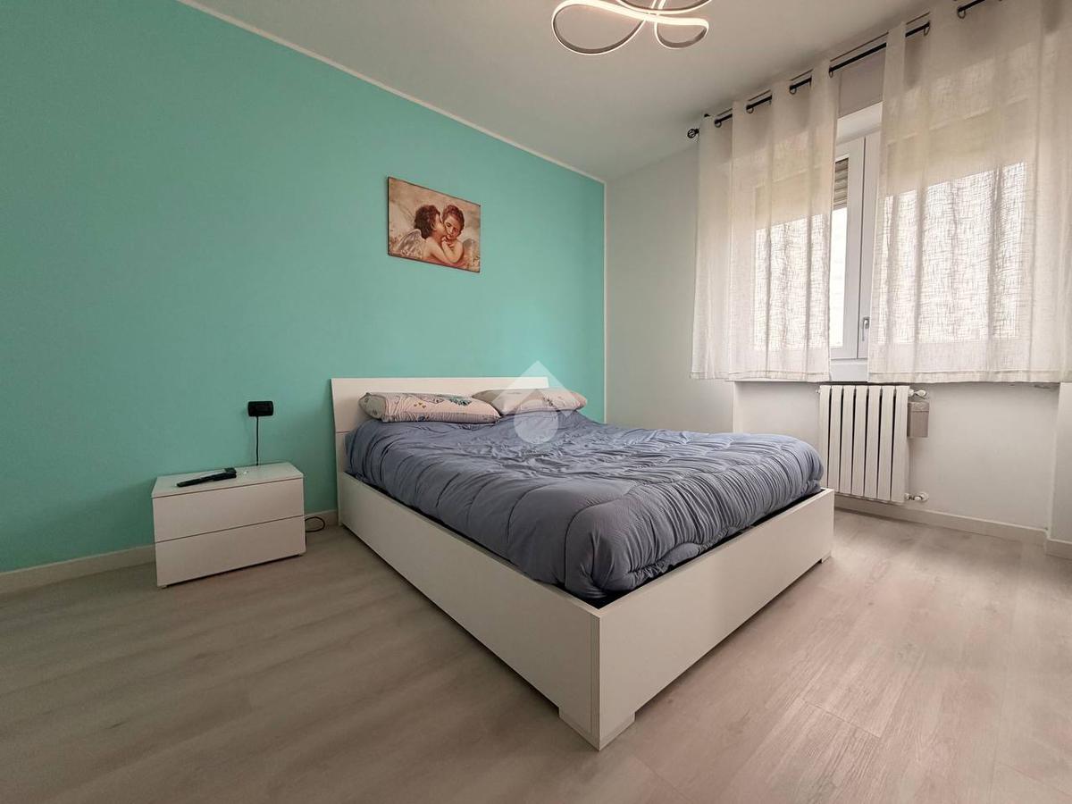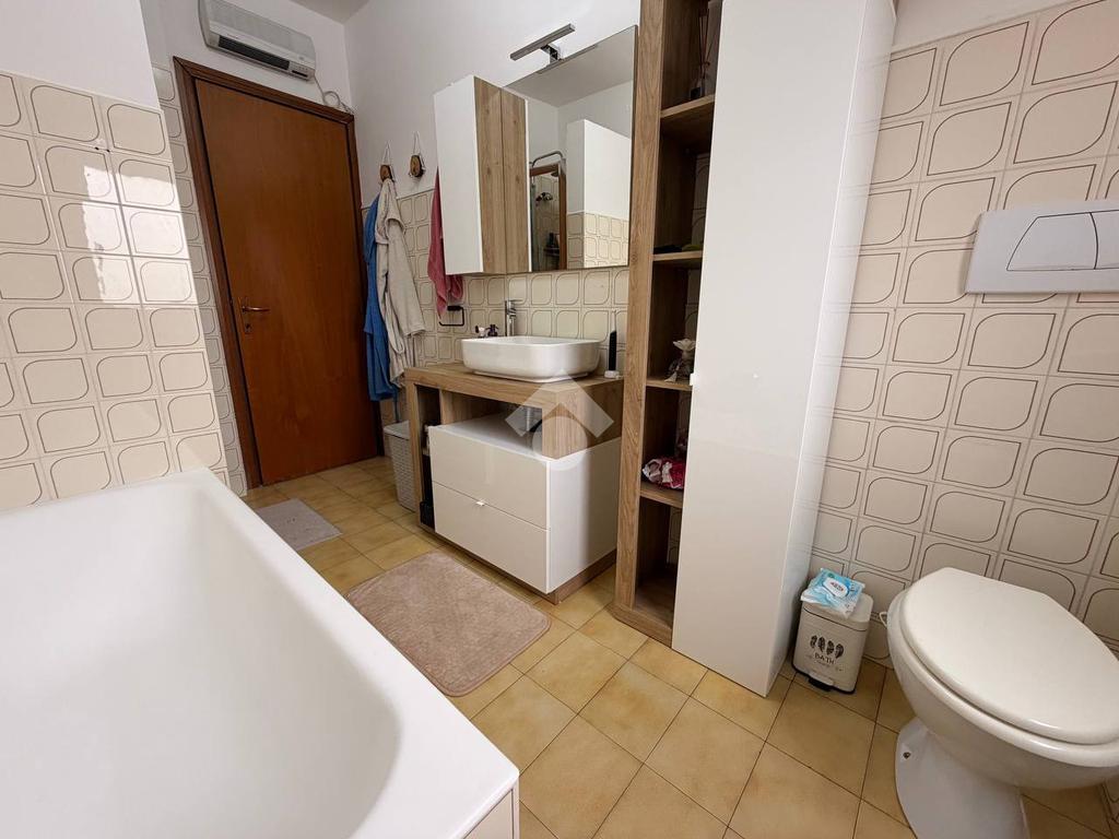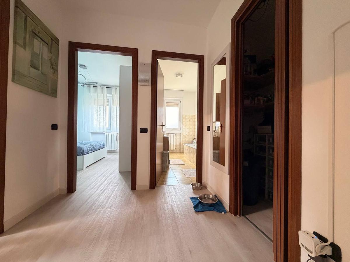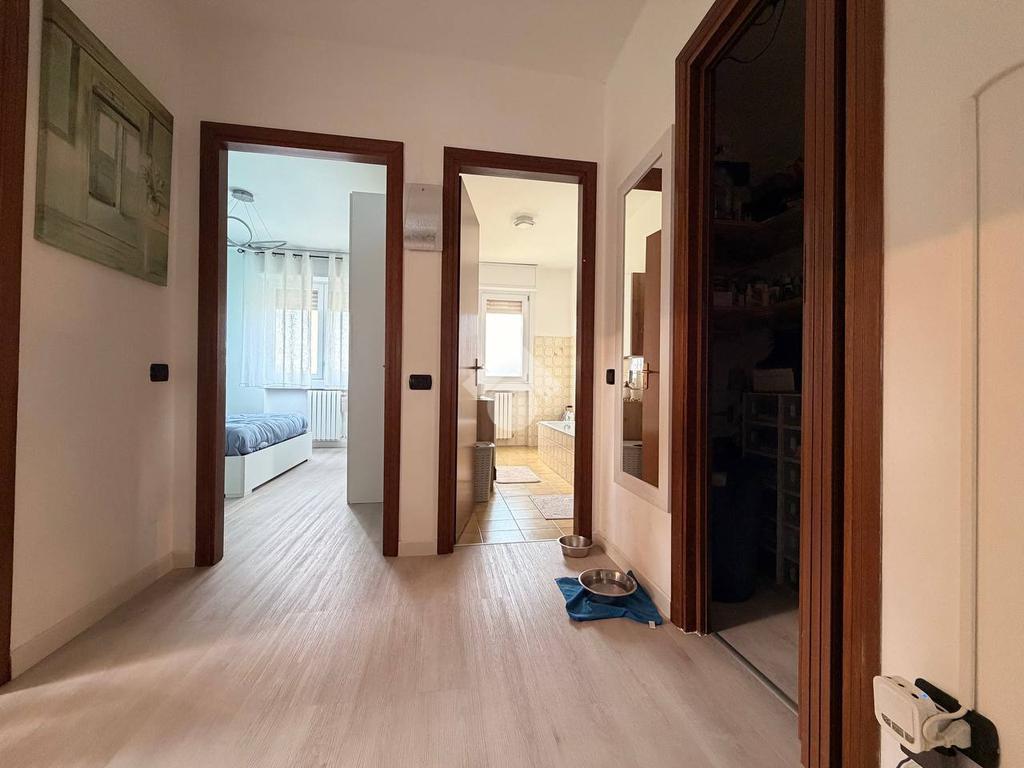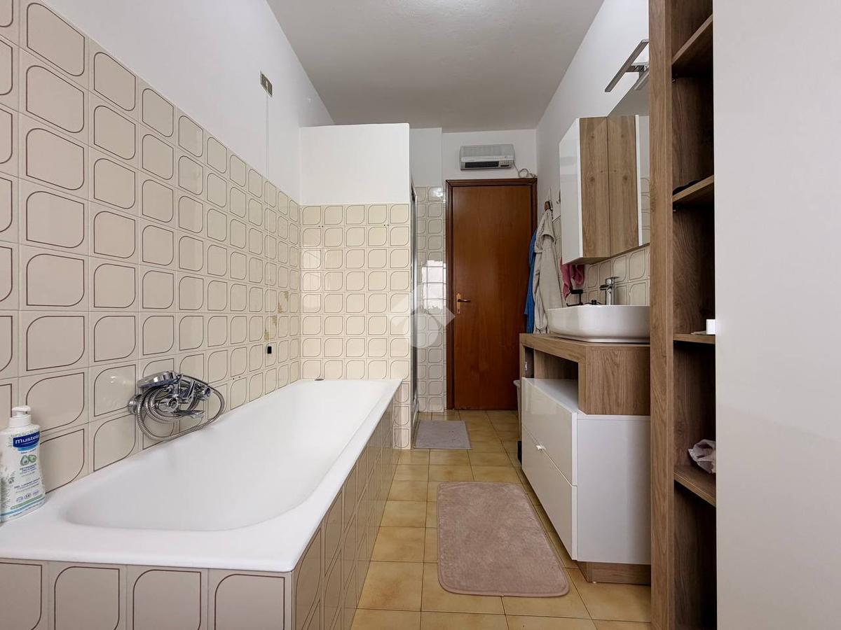 L'appartamento è composto dalla zona giorno con soggiorno ampio, accesso diretto al balcone e cucina abitabile, due camere da letto spaziose e due bagni finestrati, uno dei quali completo di box doccia e vasca.